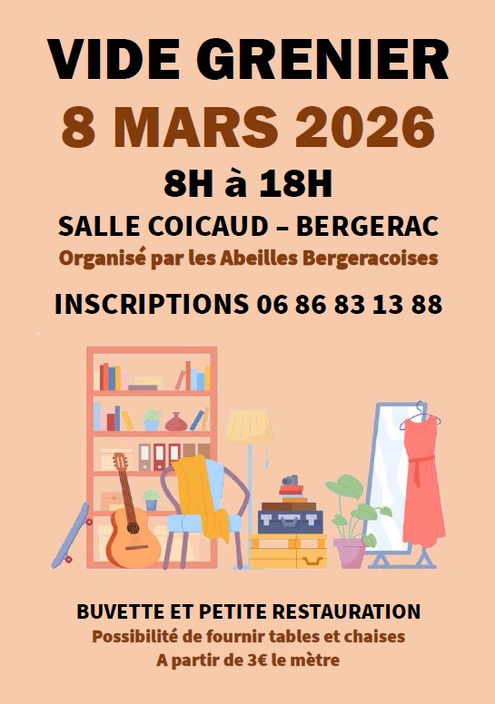 vide-grenier le 8 mars 2026, salle Coicaud à Bergerac. 3€ le mètre. Possibilité de louer une table 1 € dans la limite des stocks disponibles. Chaises fournies gratuitement. Petite restauration et buvette sur place : sandwichs, crêpes, etc... L'inscription ne sera validée qu'à la réception du dossier complet et du règlement. Pas de stand de […]