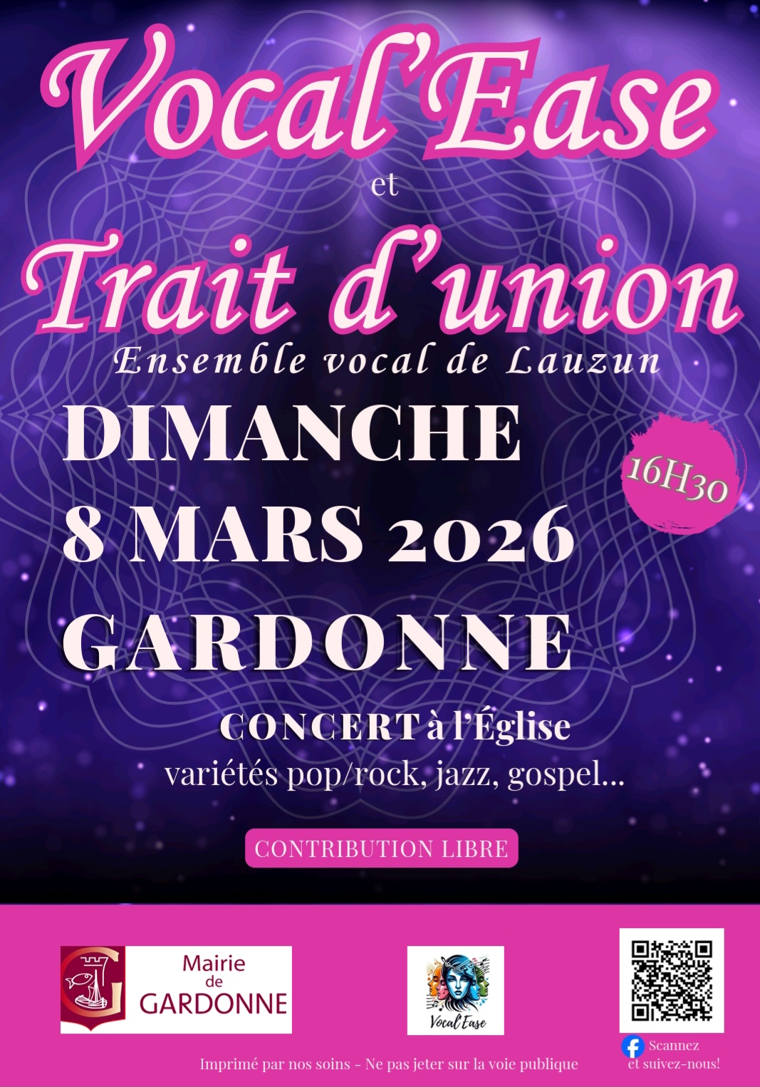 Le groupe Vocal'ease de Gardonne se produira le dimanche 8 mars 16h30 à l'église de Gardonne et aura le plaisir de partager la scène avec l'ensemble vocal Trait d'Union de Lauzun. Au programme, un répertoire résolument pop/rock, mêlant énergie, harmonies et bonne humeur !